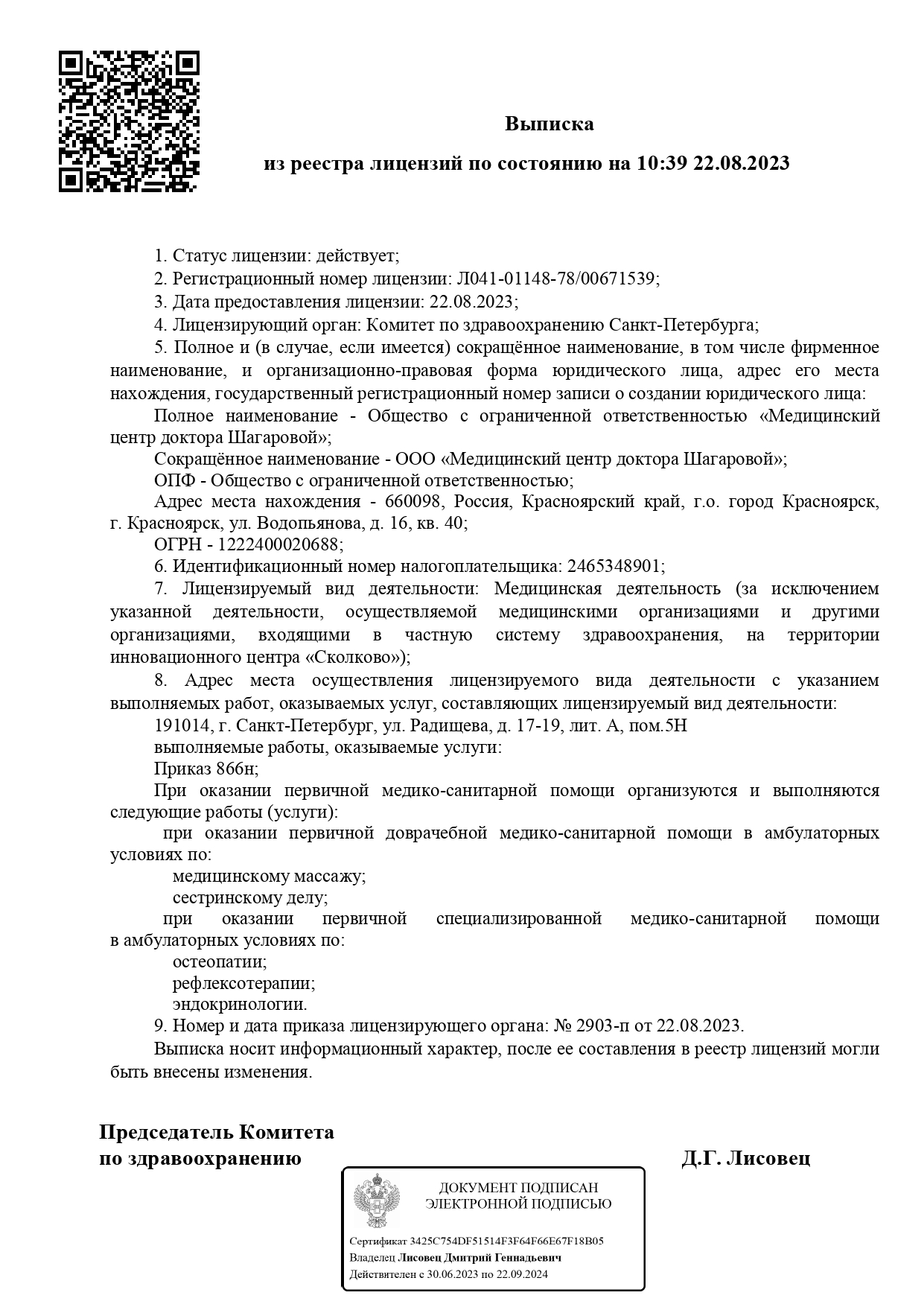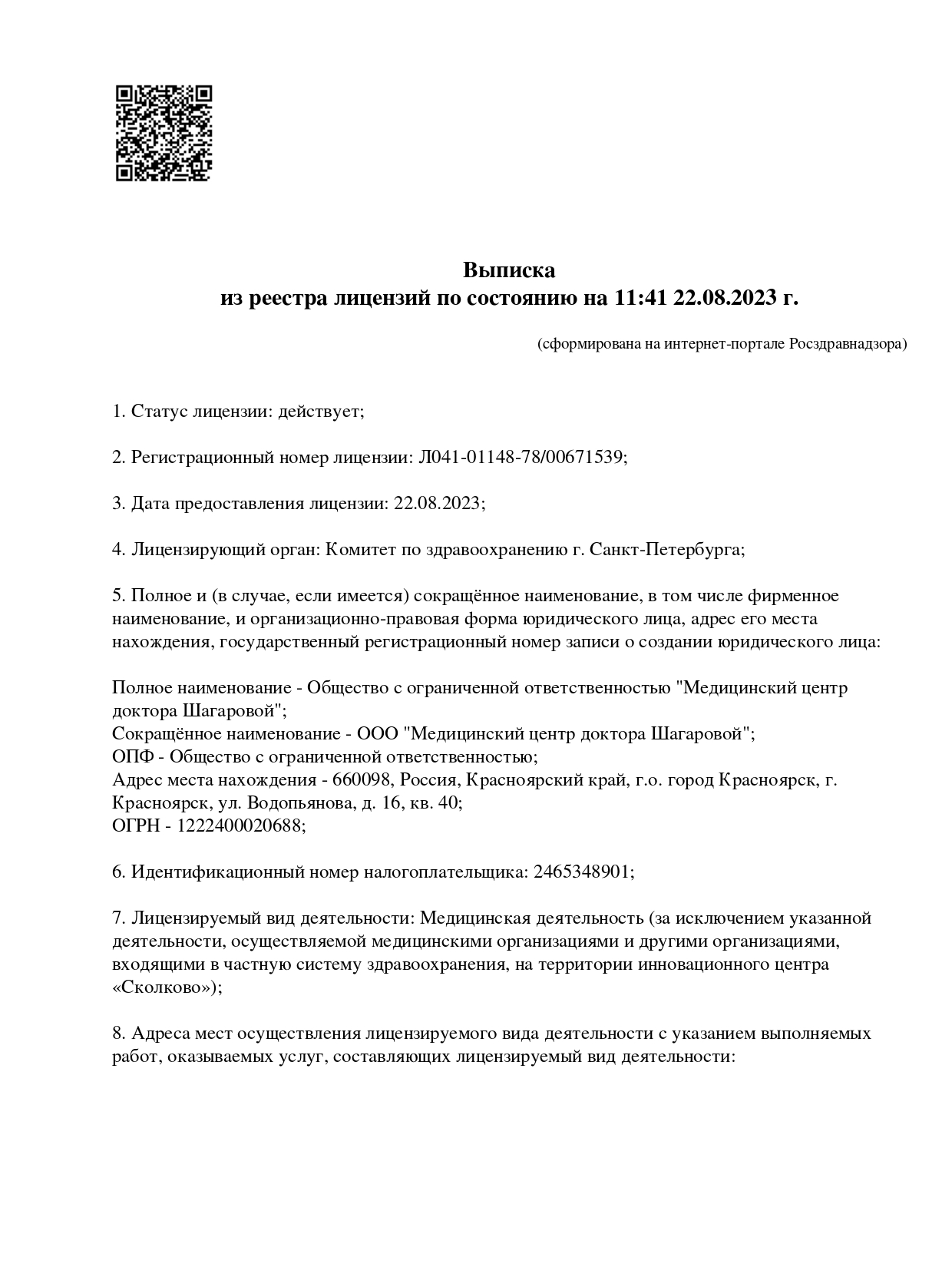Лицензия на осуществление медицинской деятельности ООО "Медицинский центр доктора Шагаровой"